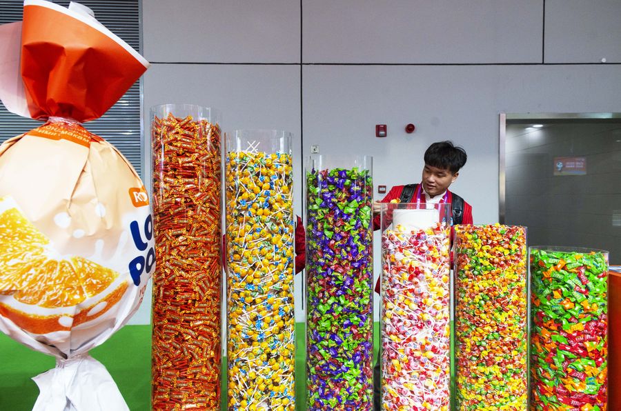A visitor takes candies at the Food and Agricultural Products exhibition area during the second China International Import Expo (CIIE) in Shanghai, east China. (Xinhua/Liu Yun)