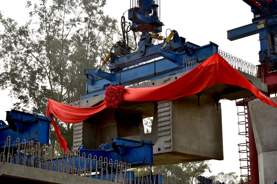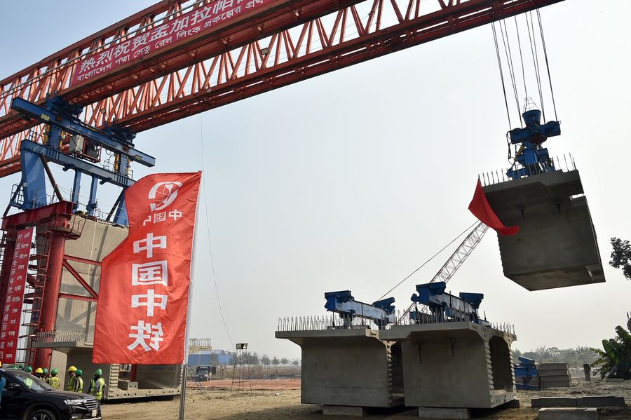 Chinese engineers erect 1st box girder of Bangladesh's longest railway viaduct