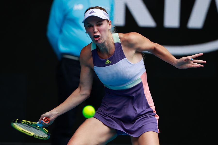 Caroline Wozniacki of Denmark hits a return during the women's singles second round match against Dayana Yastremska of Ukraine at the 2020 Australian Open tennis tournament in Melbourne, Australia, Jan. 22, 2020. (Xinhua/Wang Jingqiang)