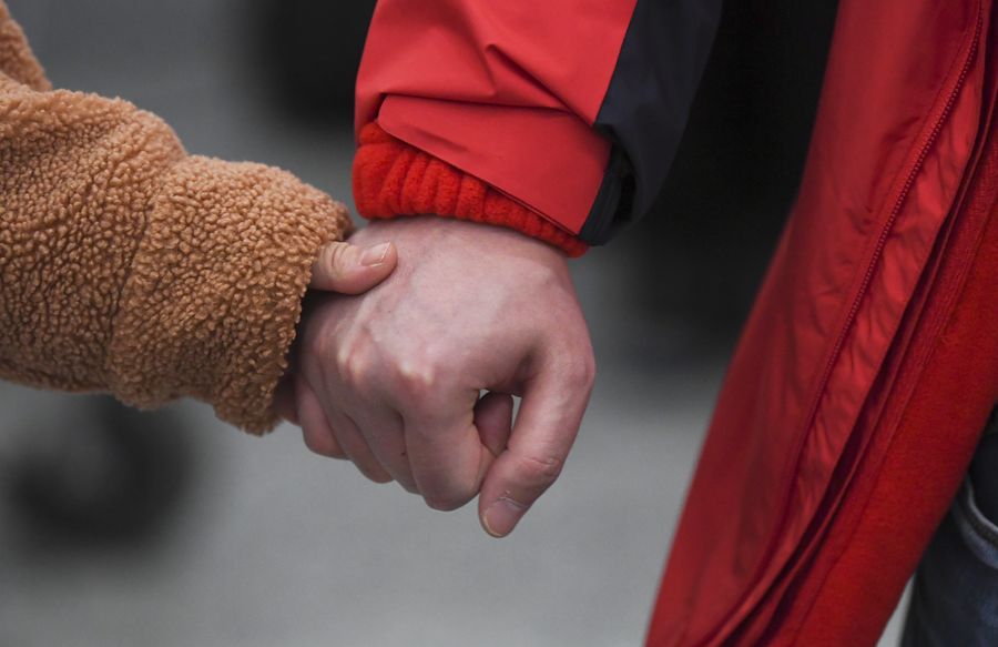 Jiang Lei (R), a doctor from the First Affiliated Hospital of Chongqing Medical University, holds his fiancee Gao Jia's hand at Chongqing Jiangbei International Airport in southwest China's Chongqing, Jan. 26, 2020. A team comprised of more than 130 medical workers from Chongqing left for Xiaogan City of Hubei Province on Sunday to aid the novel coronavirus control efforts there. (Xinhua/Wang Quanchao)