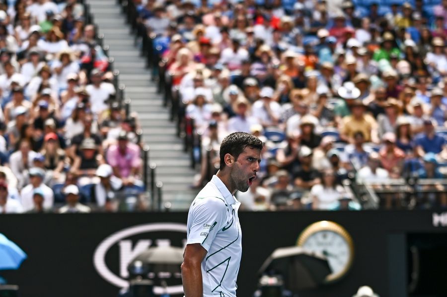Novak Djokovic of Serbia reacts during the men's singles 4th round match against Diego Schwartzman of Argentina at the Australian Open tennis championship in Melbourne, Australia on Jan. 26, 2020. (Xinhua/Zhu Wei)