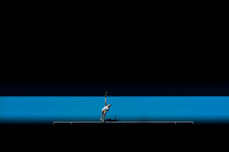 Simona Halep of Romania serves during the women's singles fourth round match against Elise Mertens of Belgium at the Australian Open tennis tournament in Melbourne, Australia on Jan. 27, 2020. Halep won the match by 2-0. (Photo by Bai Xue/Xinhua)