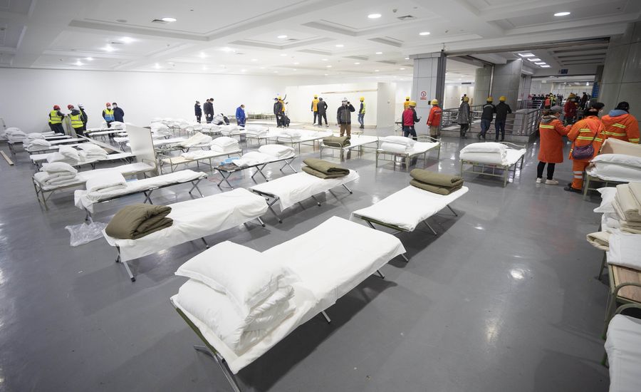 Workers are busy converting Wuhan International Conference and Exhibition Center into temporary hospital in Wuhan, central China's Hubei Province, Feb. 4, 2020. (Xinhua/Cai Yang)