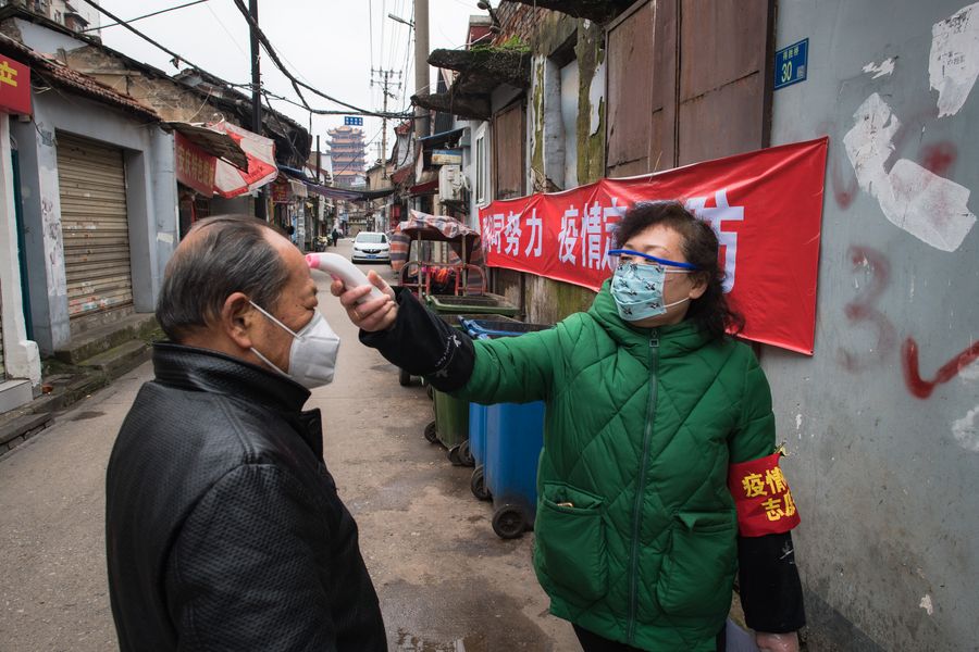 A female community worker checks body temperature for a resident at a street near the Yellow Crane Pavilion in Wuhan, central China's Hubei Province, Feb. 7, 2020. (Xinhua/Xiao Yijiu)