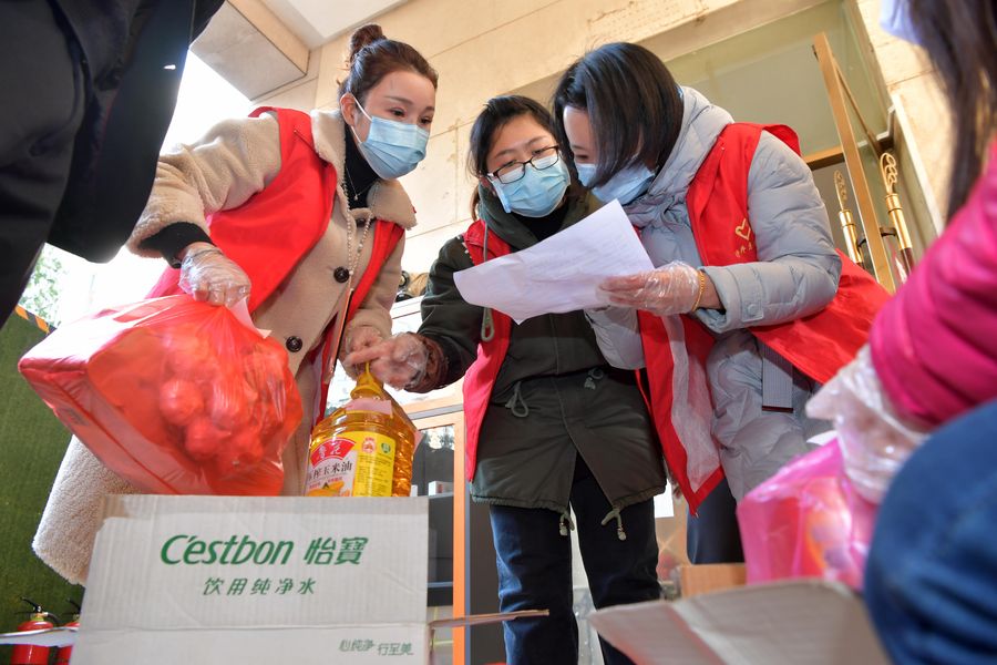 Female community workers select and pack goods for residents of a building kept in quarantine during the novel coronavirus outbreak in Nanchang, east China's Jiangxi Province, Feb. 5, 2020. (Xinhua/Peng Zhaozhi)
