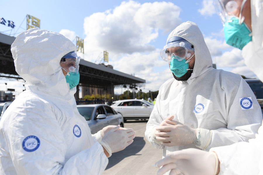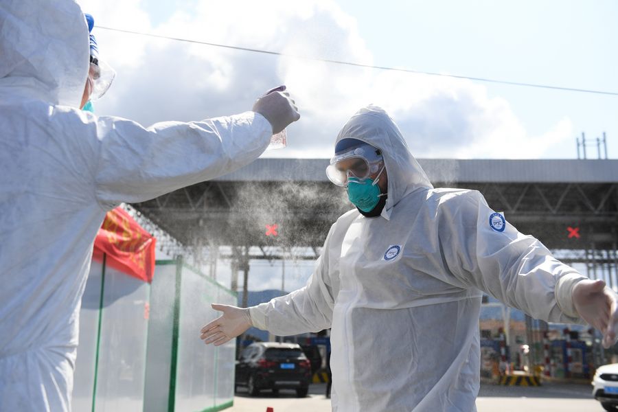 Pakistani Abdul Zahir Hamad (R) is disinfected at a novel coronavirus prevention-and-control checkpoint of an expressway exit in Wenzhou, east China's Zhejiang Province, Feb. 8, 2020.(Xinhua/Weng Xinyang)