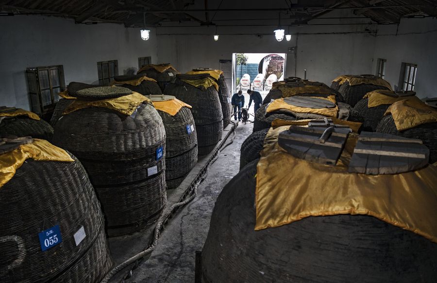 Staff members transfer liquor at a warehouse in Baoji, northwest China's Shaanxi Province, Feb. 27, 2020. (Xinhua/Tao Ming)