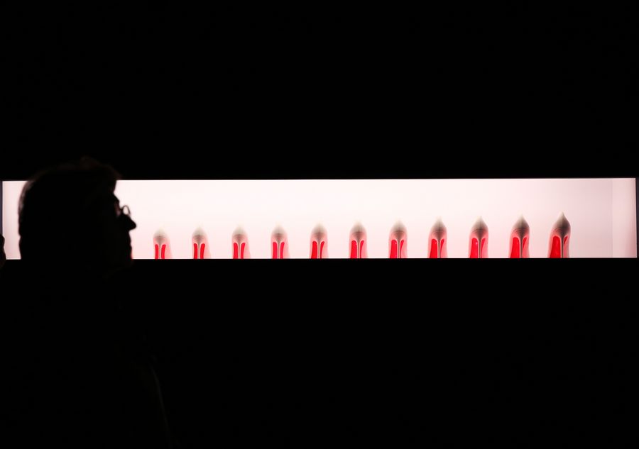 A visitor is seen at French shoe designer Christian Louboutin's exhibition at the Palais de la Porte Doree in Paris, France, Feb. 26, 2020. (Xinhua/Gao Jing)