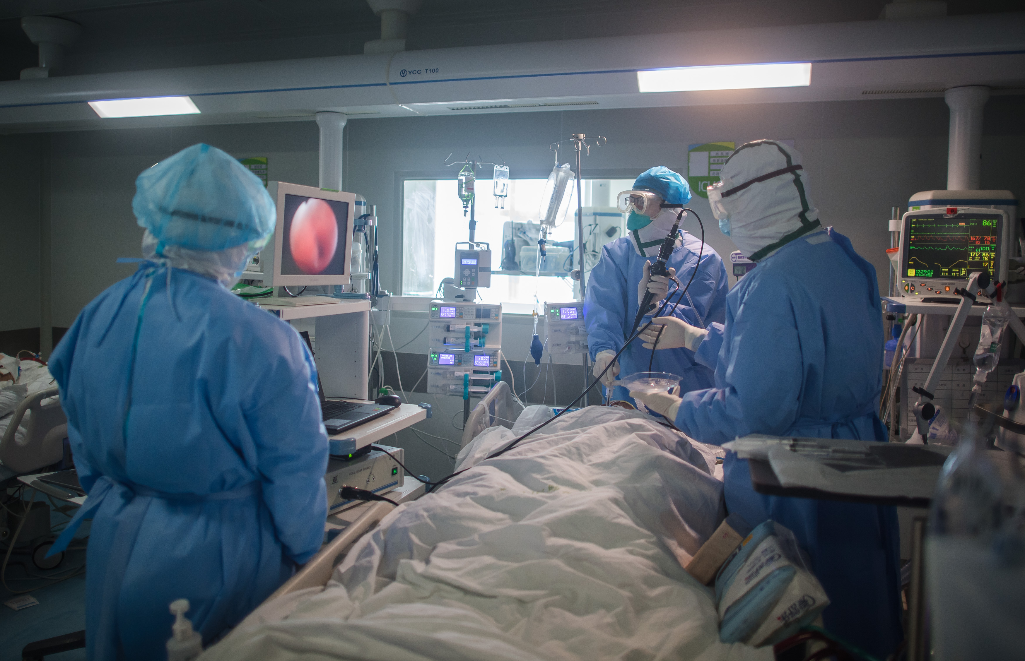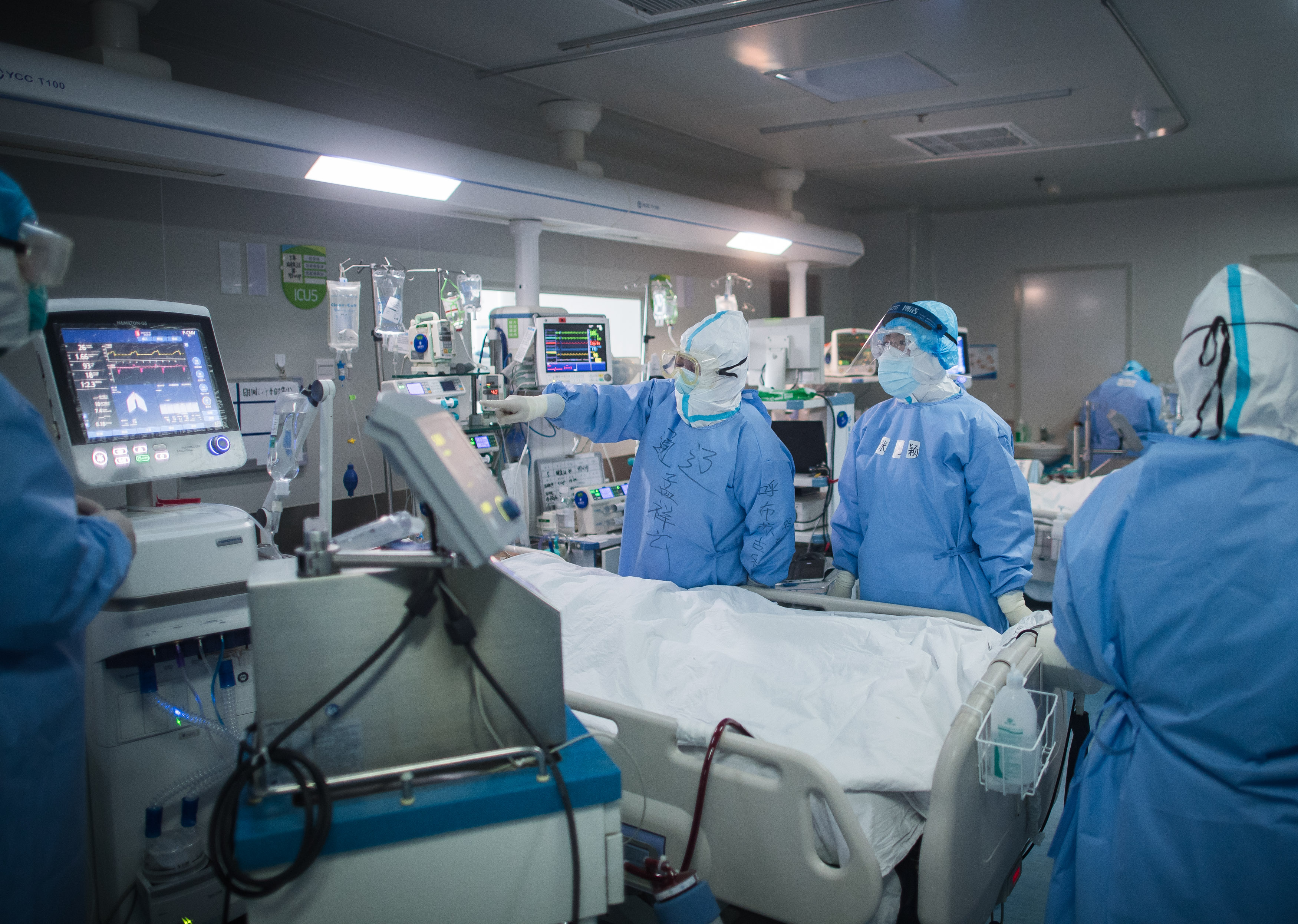 Medical workers are busy at the ICU (intensive care unit) of Wuhan pulmonary hospital in Wuhan, central China's Hubei Province, March 19, 2020. (Xinhua/Xiao Yijiu)
