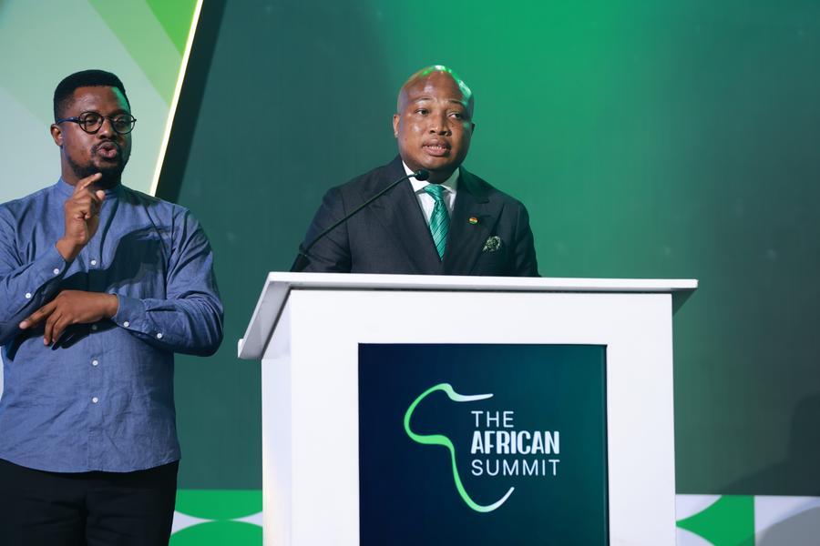 Ghana's Foreign Minister Samuel Okudzeto Ablakwa (R) delivers a speech at the African Summit in Accra, Ghana on Dec. 16, 2025. The inaugural African Summit, themed "Building a New United Africa," opened Tuesday in Accra, Ghana's capital, bringing together policymakers and stakeholders from across the continent to build consensus on a more integrated, interdependent and interconnected Africa. (The African Summit/Handout via Xinhua)