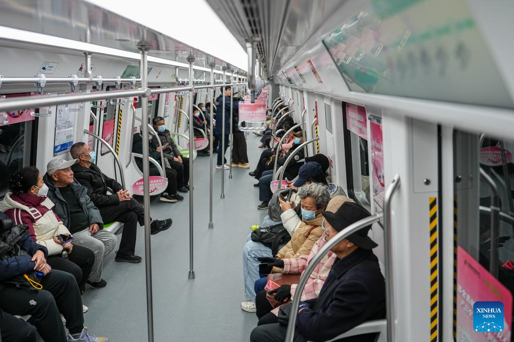 Citizens take the train of Jinan Subway Line 4, in Jinan, east China's Shandong Province, Dec. 27, 2025. China's first subway line passing through a karst spring area began operation on Saturday in Jinan, marking an engineering breakthrough that balances urban transit demands with the protection of natural water resources.