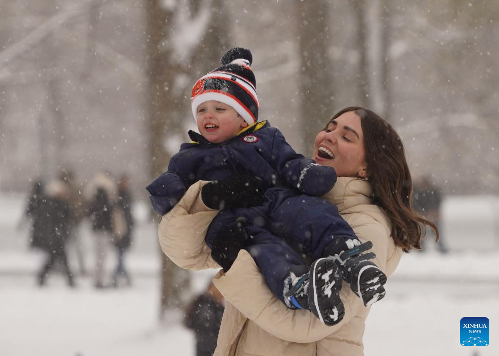 People have fun amid snow at the Central Park in New York, the United States, on Dec. 27, 2025. (Xinhua/Zhang Fengguo)