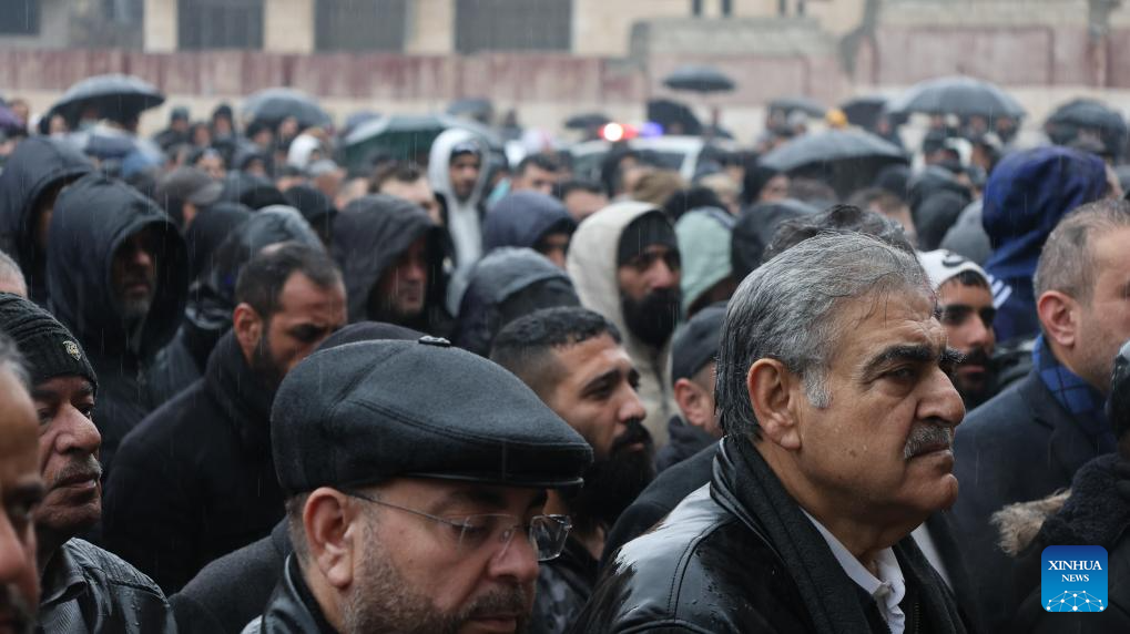 Mourners gather outside the Imam Ali bin Abi Talib Mosque during a funeral procession for victims of a blast in Homs, central Syria, Dec. 27, 2025.