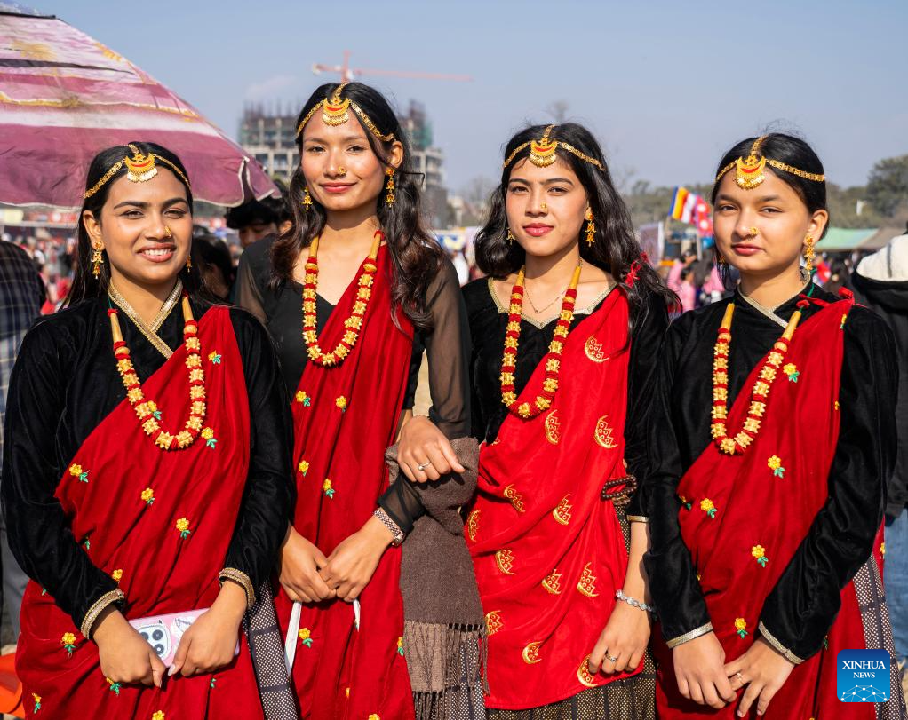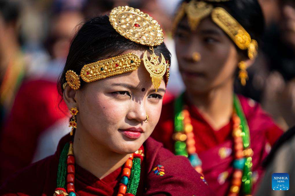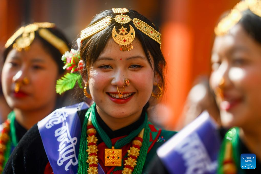 Girls in traditional attire from the Gurung community are pictured during the celebration of Tamu Lhosar festival to mark the commencement of Gurung New Year in Kathmandu, Nepal, Dec. 30, 2025. (Photo by Sulav Shrestha/Xinhua)
