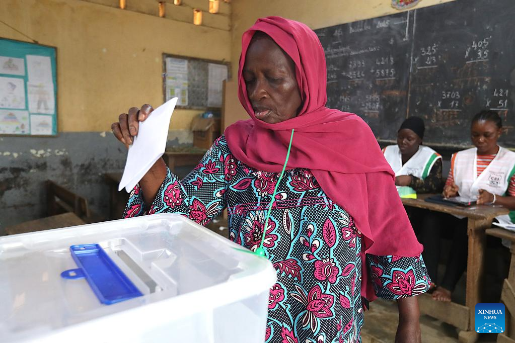 A voter casts her ballot at a polling station in Abidjan, Cote d'Ivoire, Dec. 27, 2025. Polling stations opened on Saturday morning across Cote d'Ivoire for legislative elections to renew the 255 seats of the National Assembly, Xinhua reporters observed on site in Abidjan, the country's economic capital.(Photo by Yvan Sonh/Xinhua)