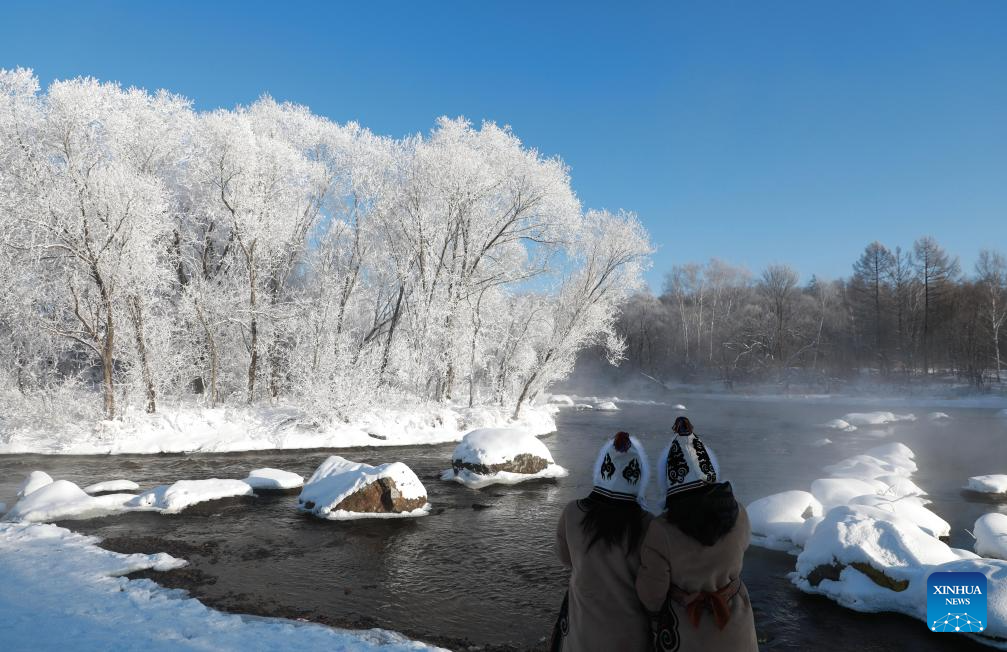 Tourists visit a rime-themed scenic spot in Xunke County, northeast China's Heilongjiang Province, on Dec. 26, 2025. (Photo by Wang Dong/Xinhua)