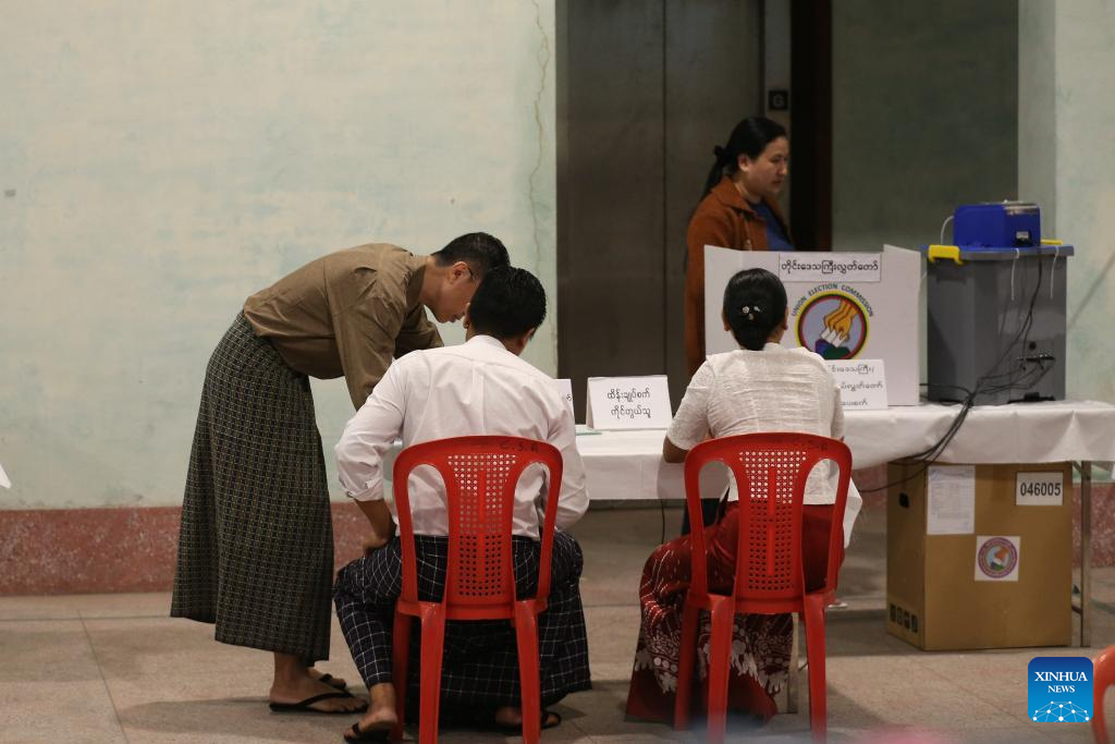 This photo taken on Dec. 28, 2025 shows a scene at a polling station in Yangon, Myanmar. Myanmar kicked off its 2025 multi-party democratic general election with the first phase held on Sunday. The general election is scheduled to be held in three phases, with the second phase set for Jan. 11, 2026, followed by the third phase on Jan. 25. (Xinhua/Myo Kyaw Soe)