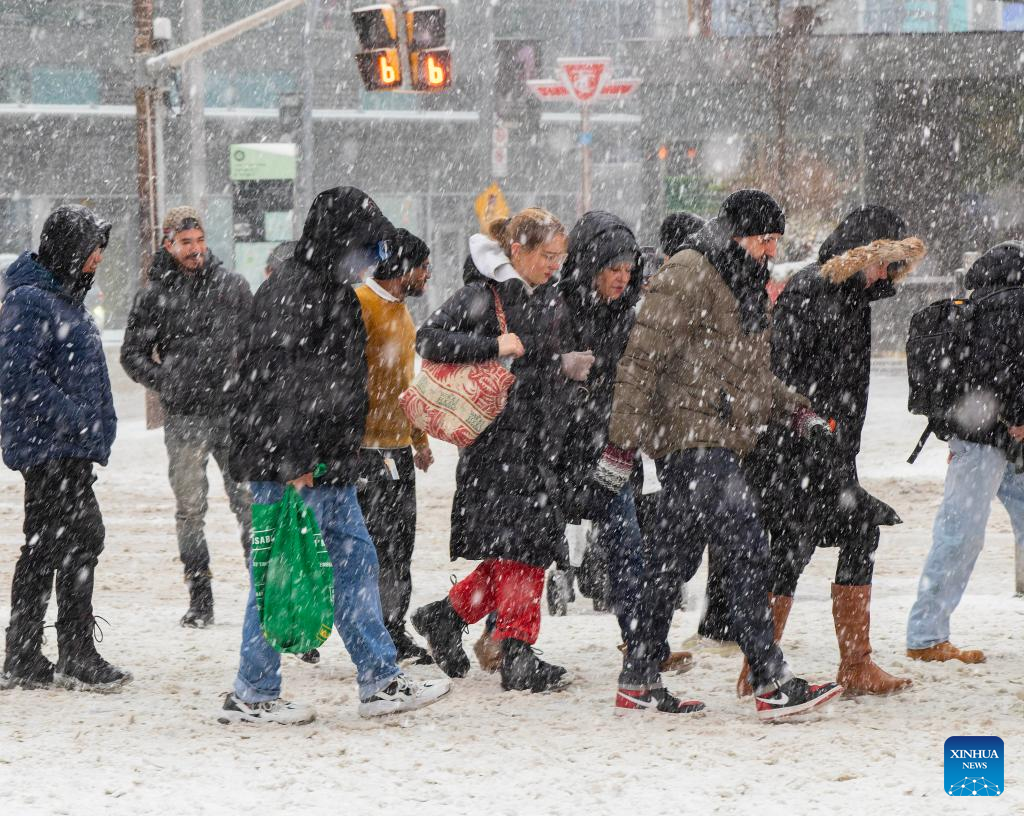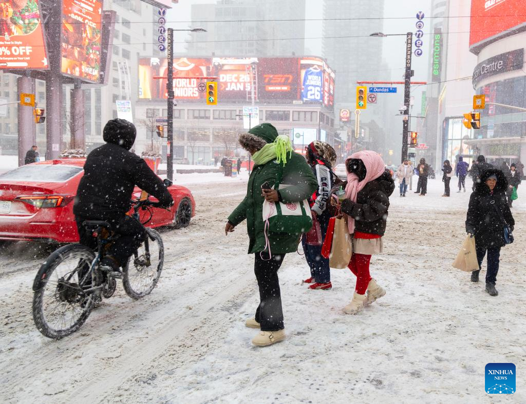 People walk on a street during a snowy day in Toronto, Canada, on Dec. 26, 2025. (Photo by Zou Zheng/Xinhua)