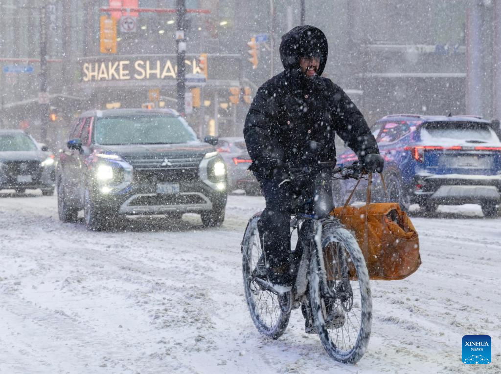 A man rides an e-bike during a snowy day in Toronto, Canada, on Dec. 26, 2025. (Photo by Zou Zheng/Xinhua)