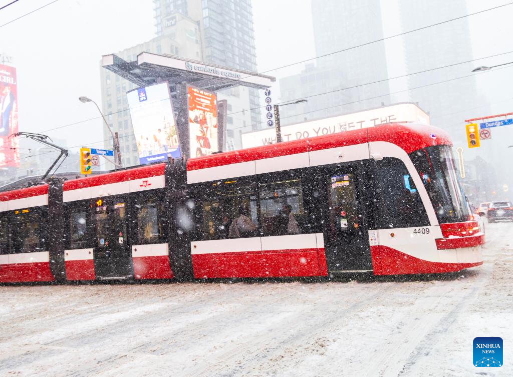 A streetcar runs during a snowy day in Toronto, Canada, on Dec. 26, 2025. (Photo by Zou Zheng/Xinhua)