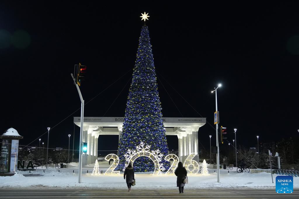 New Year signs and decorations are seen along a street in Astana, Kazakhstan, Dec. 26, 2025. Astana has been adorned in festive decorations recently as the New Year approaches. (Photo by Kalizhan Ospanov/Xinhua)