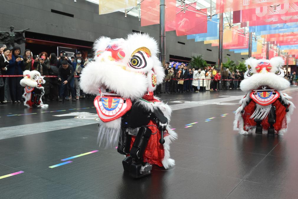 12月22日,机器人在国家大剧院北水下廊道进行“舞狮”表演。新华社记者 罗晓光 摄