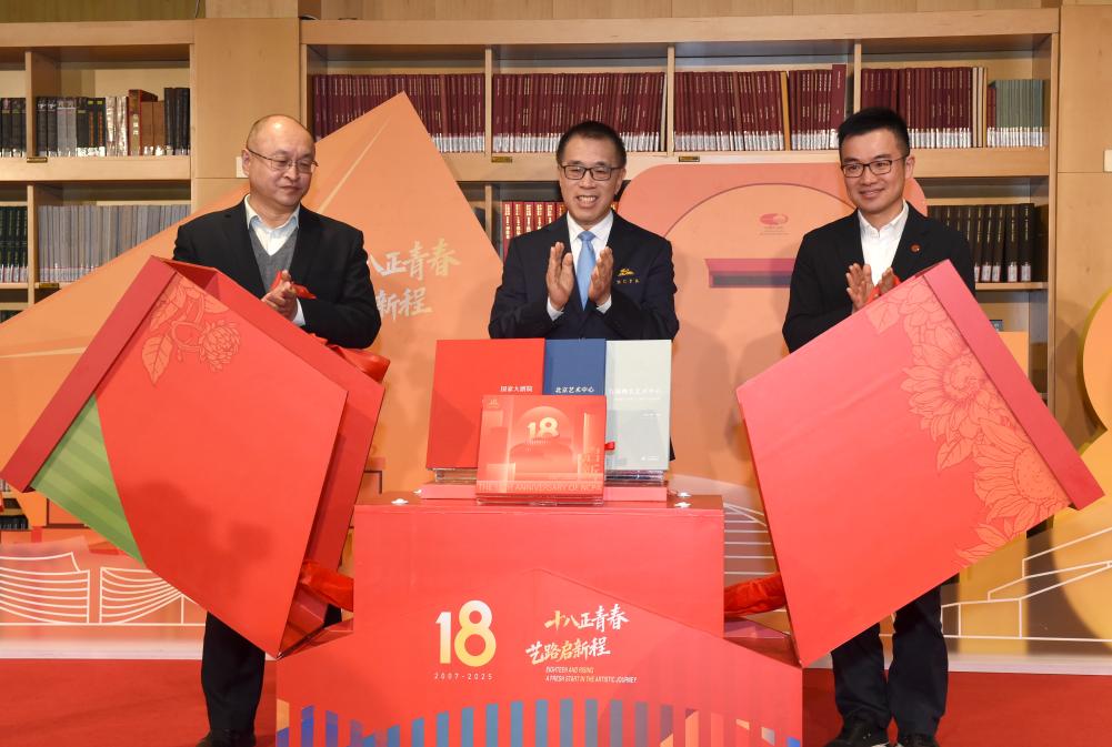 12月22日,国家大剧院院长王宁(中)、北京工艺美术出版社社长夏中南(左)、中信出版集团董事长陈炜共同见证建院18周年“一院三址”系列画册和“艺术礼物”系列普及读物的全新发布。新华社记者 罗晓光 摄