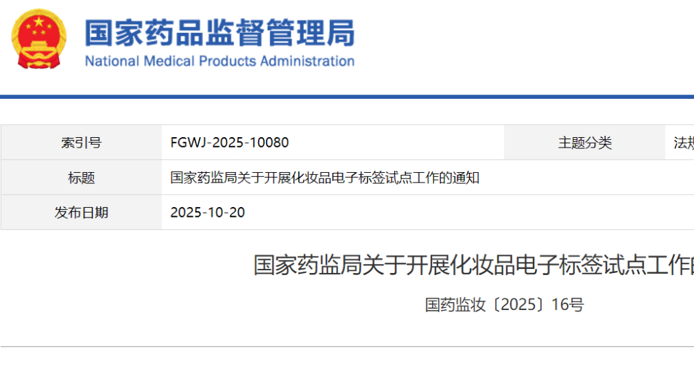 國家藥監(jiān)局關(guān)于開展化妝品電子標(biāo)簽試點(diǎn)工作的通知 國藥監(jiān)妝〔2025〕16號(hào)