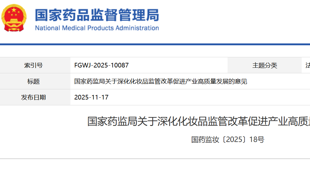 國家藥監(jiān)局關(guān)于深化化妝品監(jiān)管改革促進(jìn)產(chǎn)業(yè)高質(zhì)量發(fā)展的意見 國藥監(jiān)妝〔2025〕18號(hào)