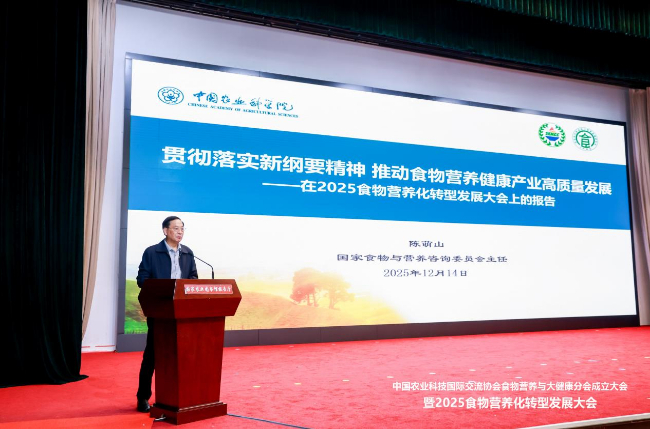 12月14日,中国农业科技国际交流协会食物营养与大健康分会成立大会暨2025食物营养化转型发展大会在北京中国农业科学院国家农业图书馆报告厅隆重召开。会议以“营养转型,健康升级”为主题,深入研讨了供给端营养型农产品、营养健康食品产业发展痛点问题、消费端大健康产业发展模式与路径。