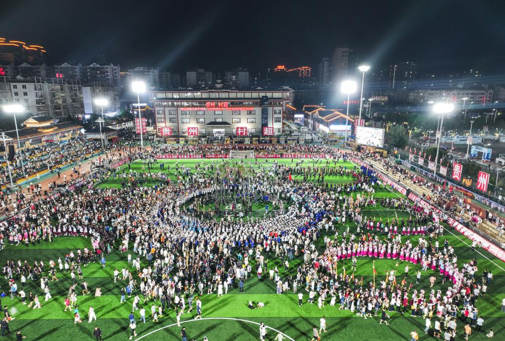 8月23日,人们在贵州“村超”球场跳苗族芦笙舞(无人机照片)。
