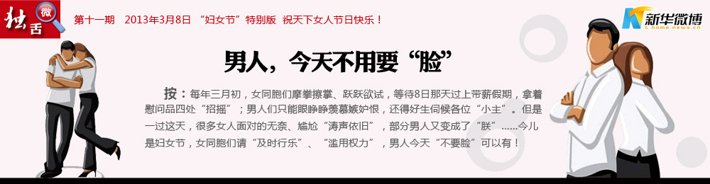 @蘄鄉(xiāng)農(nóng)夫: 在婦女節(jié)到來(lái)之時(shí),向長(zhǎng)期戰(zhàn)斗在試衣間,看韓劇,不做飯,魅力十足并掌握另一半錢包的杰出女性們致以節(jié)日的問(wèn)候。祝所有美女們:三圍魔鬼化,收入白領(lǐng)化,家務(wù)甩手化,快樂日?;?,愛情持久化,情調(diào)小資化,購(gòu)物瘋狂化,老公奴隸化,祝三八婦女節(jié)快樂!