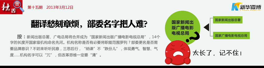 @霸氣外漏:【交通部也改了吧!】建議全稱為“國(guó)家新聞出版廣播電影電視微博微信彩信總管理局”,交通部應(yīng)該為“國(guó)家汽車(chē)火車(chē)飛機(jī)輪船摩托自行車(chē)部” 。