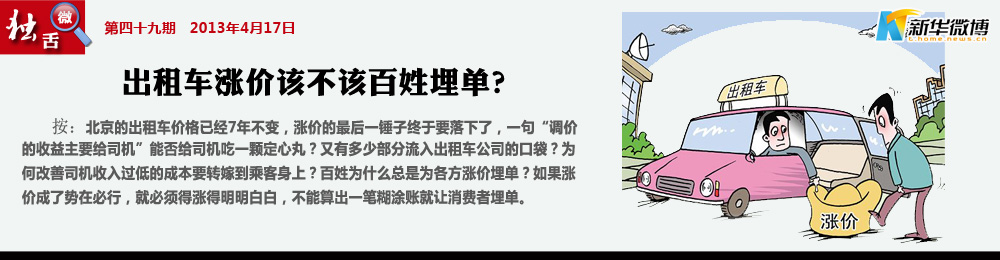 一粬:需考慮全國人民的感受 反對(duì)出粗車漲價(jià),北京出租車漲價(jià)的理由居然是根據(jù)北京居民和工薪階層工資上漲幅度為理由,確實(shí)是特權(quán)利益階層短視經(jīng)不起推敲的謬見,北京是全體國家公民一生中最少去一次的城市,所有窗口行業(yè)的收費(fèi)確實(shí)不只是一個(gè)城市的小事情,須思考全國人民的感受。