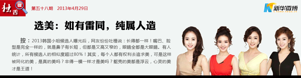 【選美?公然作弊?】 整容技術(shù)越來越先進(jìn),偽造美麗卻到了該反思的地步。韓國(guó)小姐的比賽分為真、善、美三個(gè)競(jìng)賽部分?,F(xiàn)在看來,比賽已經(jīng)無法體現(xiàn)“真”這個(gè)部分了。