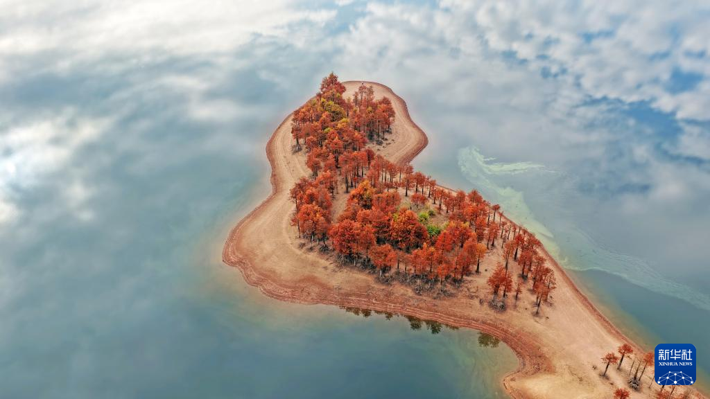 12月9日,游客在江苏省扬州市渌洋湖湿地公园“水上森林”游玩(无人机照片)。