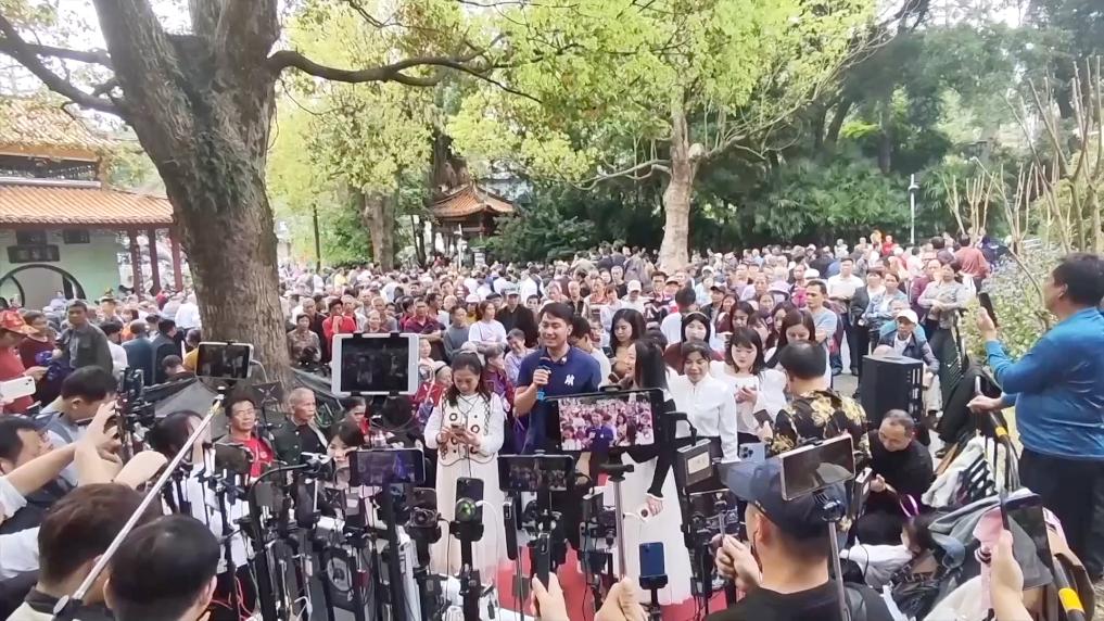 广西素有“歌海”之称,冬日里的雨天寒冷潮湿,但柳州市鱼峰公园仍如常聚集着大批歌手与歌友。网名为“山三妹”的山歌手韦莉莉正与徒弟一同直播唱山歌。