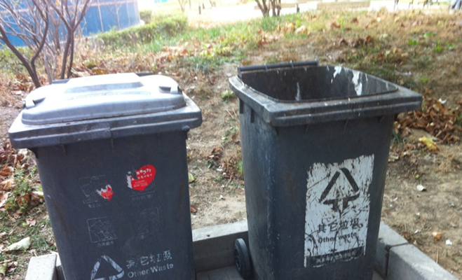 除了幾棵大樹之外,小區(qū)基本上沒有綠化,以前貌似種過綠草的地方,如今枯黃一片。垃圾桶早就已經(jīng)破舊不堪,在殘留的文字上,依稀可見當(dāng)時(shí)也曾嘗試過的垃圾分類。小區(qū)內(nèi)沒有兒童休息場(chǎng)所、也沒有健身器材,只是設(shè)有幾個(gè)孤零零的座椅。