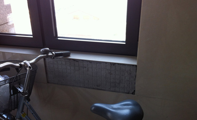 當記者與劉爺爺來到他居住的樓門前時,發(fā)現(xiàn)大門并沒有門禁,劉爺爺對記者說,看上去豪華的大門,其實一點都不實用。記者試了一下,發(fā)現(xiàn)確實很沉重,如果孩子自己開門,估計很難打開。劉爺爺說這個小區(qū)的實際質(zhì)量和宣傳相差甚遠,樓內(nèi)的瓷磚有掉落現(xiàn)象,安全梯鋪設的十分簡陋。劉爺爺讓記者從十五層向下俯視,小區(qū)所宣傳的法式園林只是一些楊樹和柳樹。庭院中間的小涼亭連休息的椅子都沒有,基本都是擺設。