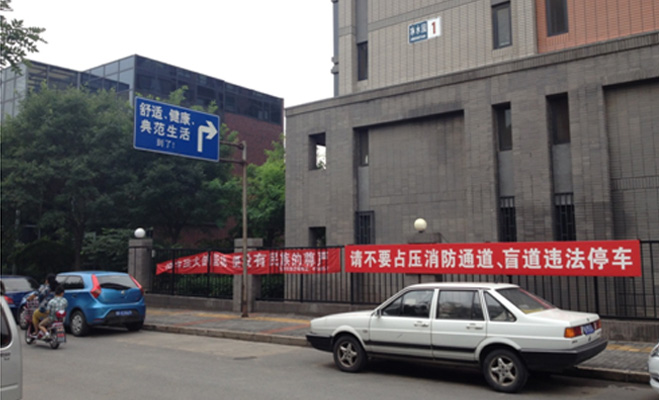而對于購買了私家車的業(yè)主而言,每天進出小區(qū)也不太方便。記者注意到,盡管嚴禁占用消防通道的橫幅懸掛在凈水東路兩側(cè),但是,這里依然幾乎停滿了私家車,還有幾輛為了節(jié)約空間,橫著停放在行人道上。