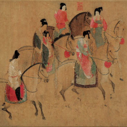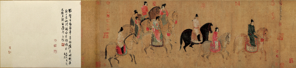 《虢国夫人游春图》描绘天宝年间杨贵妃之姊虢国夫人及其眷从盛装游春的场景。画中八骑九人,布局疏密有致,人物从容优雅,马匹步伐轻快,全卷虽不设背景,却处处洋溢着春日郊游的闲适与华贵。