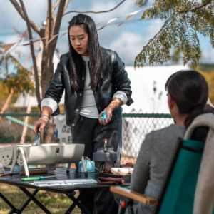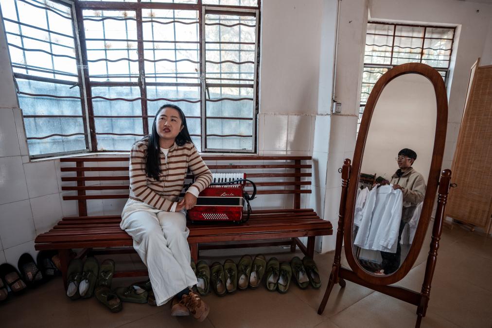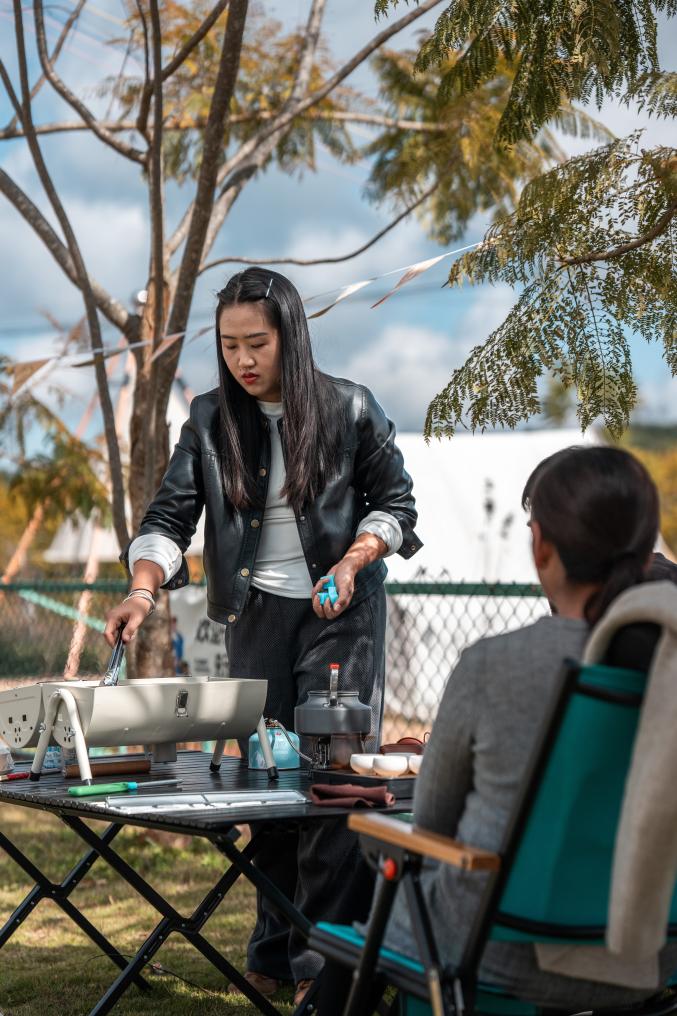 魏春(左)在大渡岗乡新开业的露营地为游客准备烧烤用品。