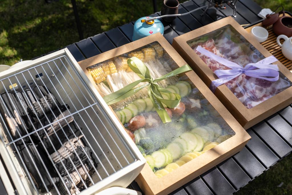 魏春(前)和工作人员在大渡岗乡大干坝村的露营地为顾客端上精心包装的烧烤食材。