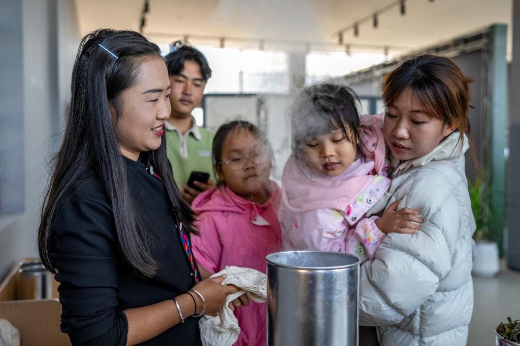 魏春(左一)在大渡岗乡“热土工作室”给前来研学的小朋友讲解普洱茶饼的制作方法。