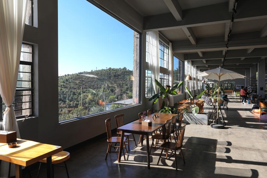 游客在大渡岗乡“热土工作室”品饮咖啡、打卡拍照。