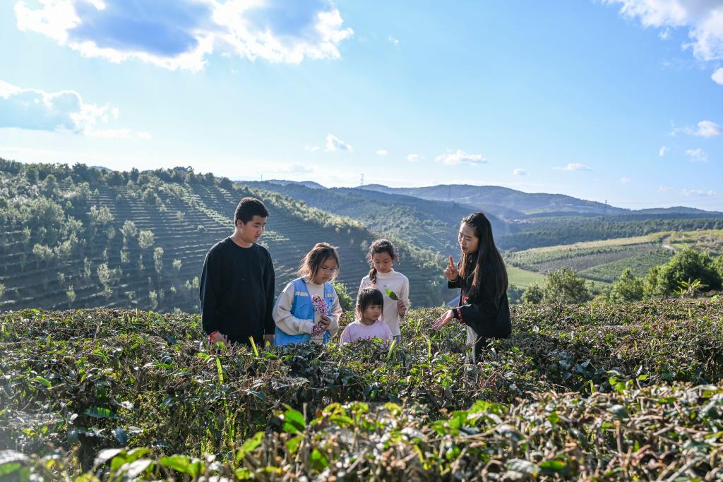 魏春(右一)带领小朋友在大渡岗乡的茶园里研学。