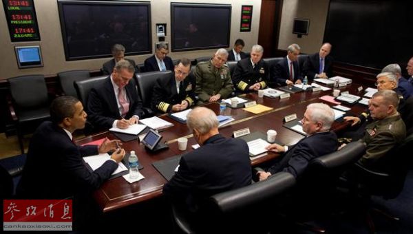 ??? 資料圖:2009年10月,美國(guó)總統(tǒng)奧巴馬在白宮時(shí)局值班室與美軍參謀長(zhǎng)聯(lián)席會(huì)議成員及高級(jí)軍事顧問商討阿富汗作戰(zhàn)事宜。