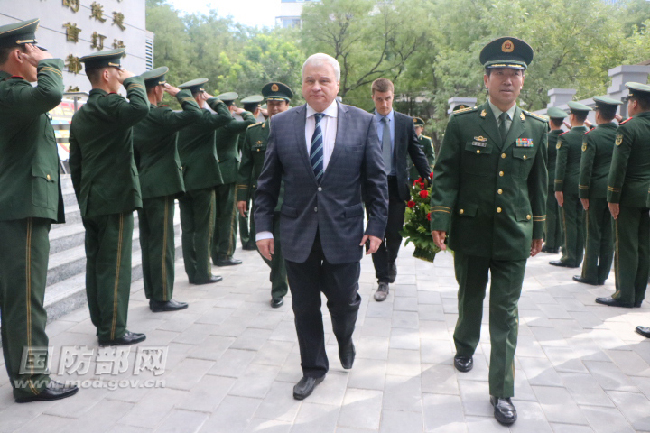 俄羅斯駐華大使安德烈·杰尼索夫向武警警衛(wèi)部隊(duì)李登貴烈士雕塑敬獻(xiàn)花籃