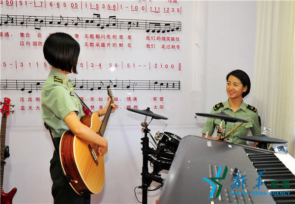 多才多藝的高向云與戰(zhàn)友切磋樂器演奏技藝。張立培 攝