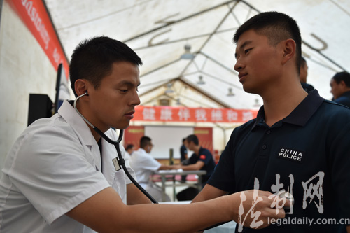 圖為醫(yī)護(hù)人員使用聽(tīng)診器對(duì)隊(duì)員身體進(jìn)行檢查